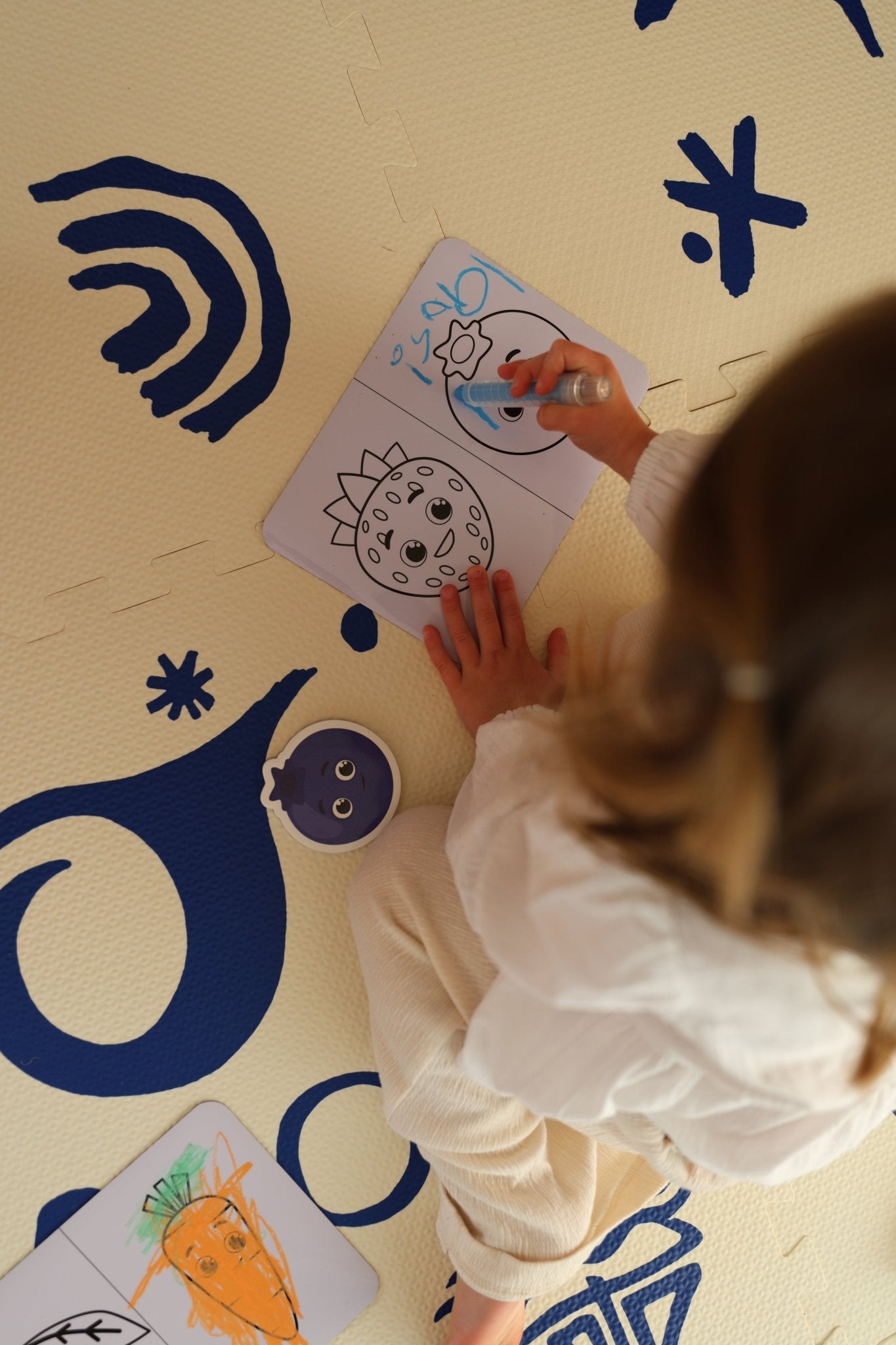 Each card features a cute, friendly fruit or veggie just waiting to be brought to life with colour. Designed for little hands and big imaginations, these cards can be coloured, wiped clean, and used again and again — no waste, no limits!